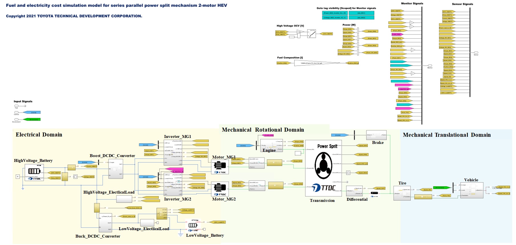 2モーター、エンジン、動力分割機構、車両、低圧バッテリー、高圧バッテリーを組み合わせたシリーズパラレル式動力分割機構 2Motor-HEVモデルである。