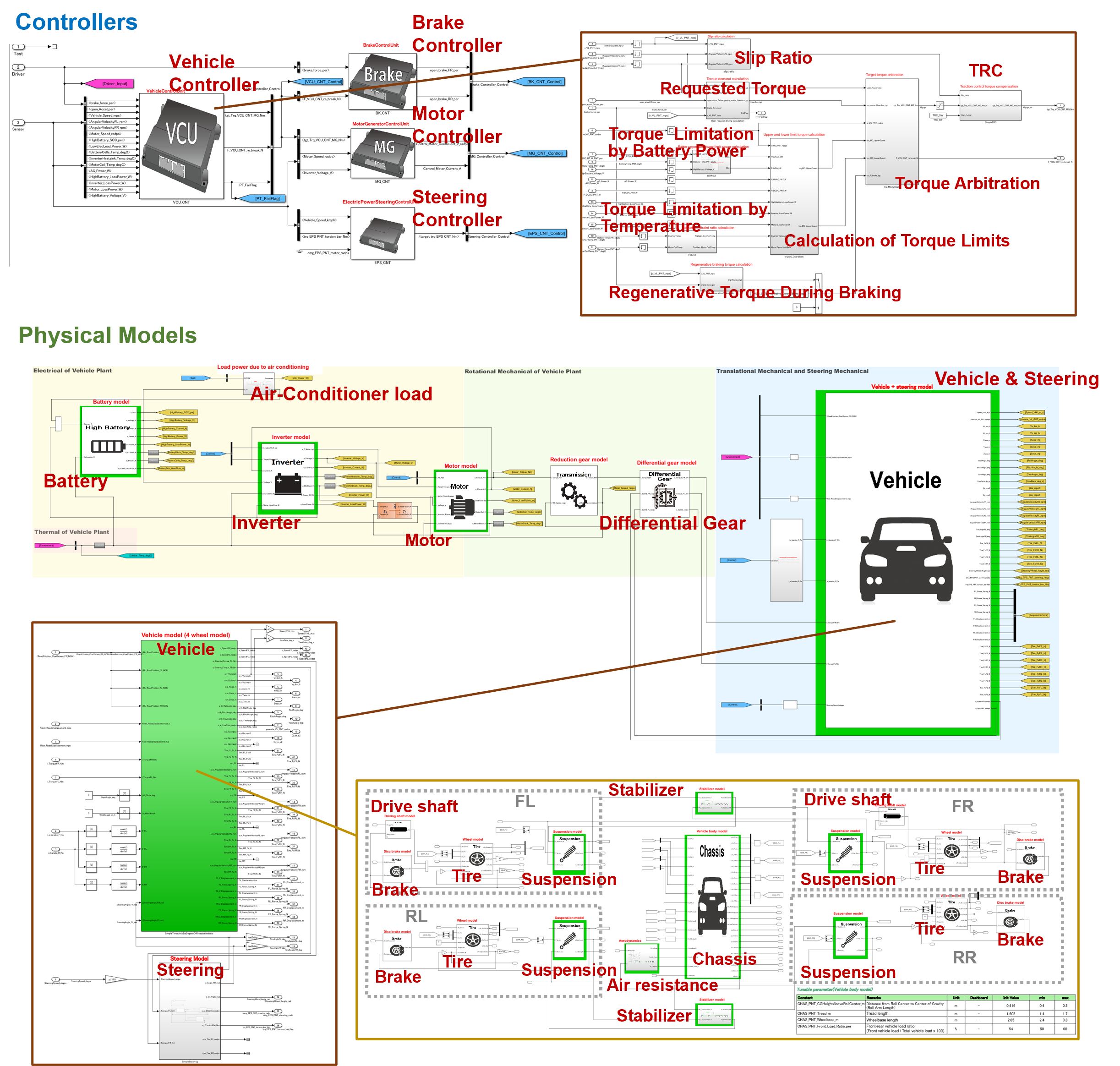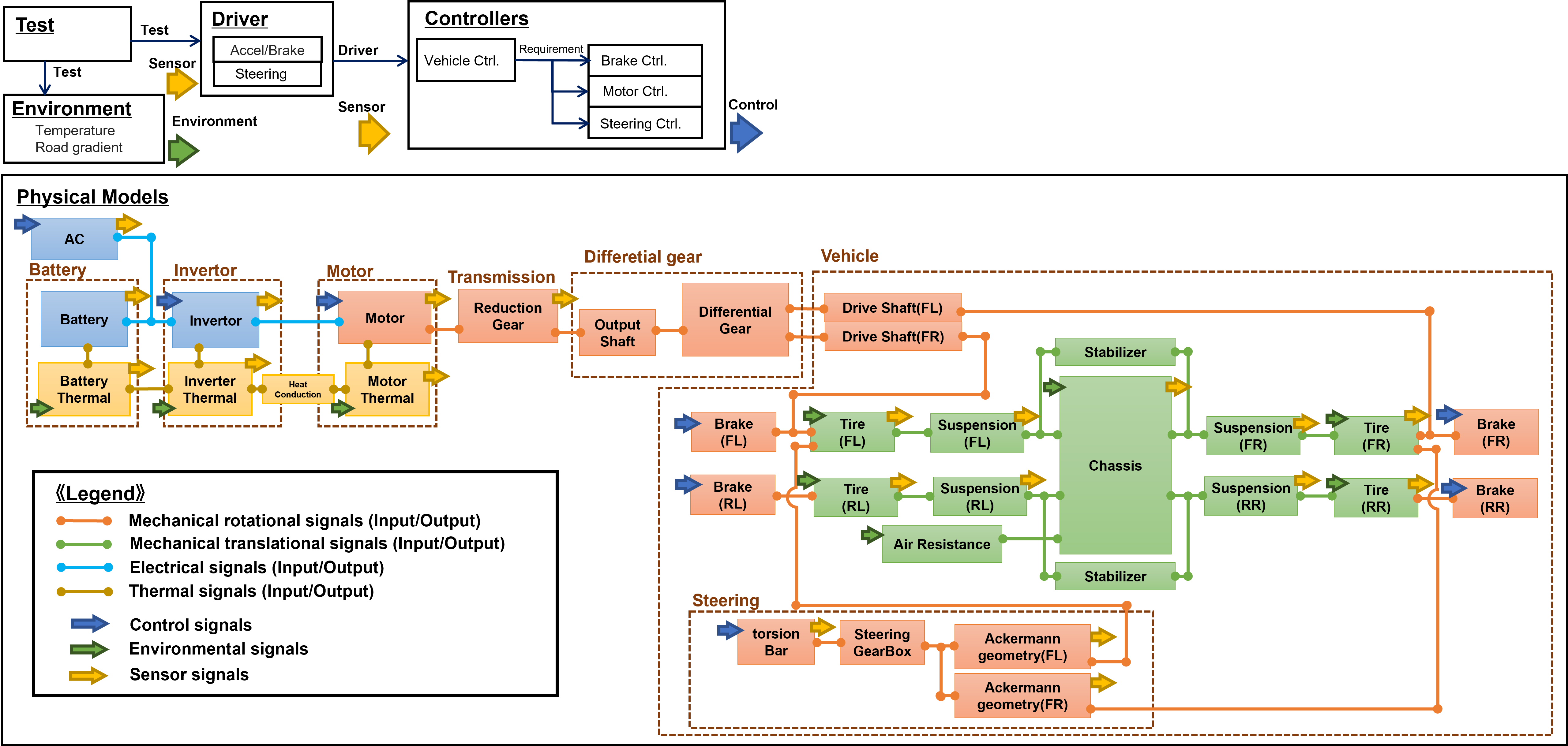 車両制御 (Controllers) と 車両プラントモデル (Physical Models) のブロック図