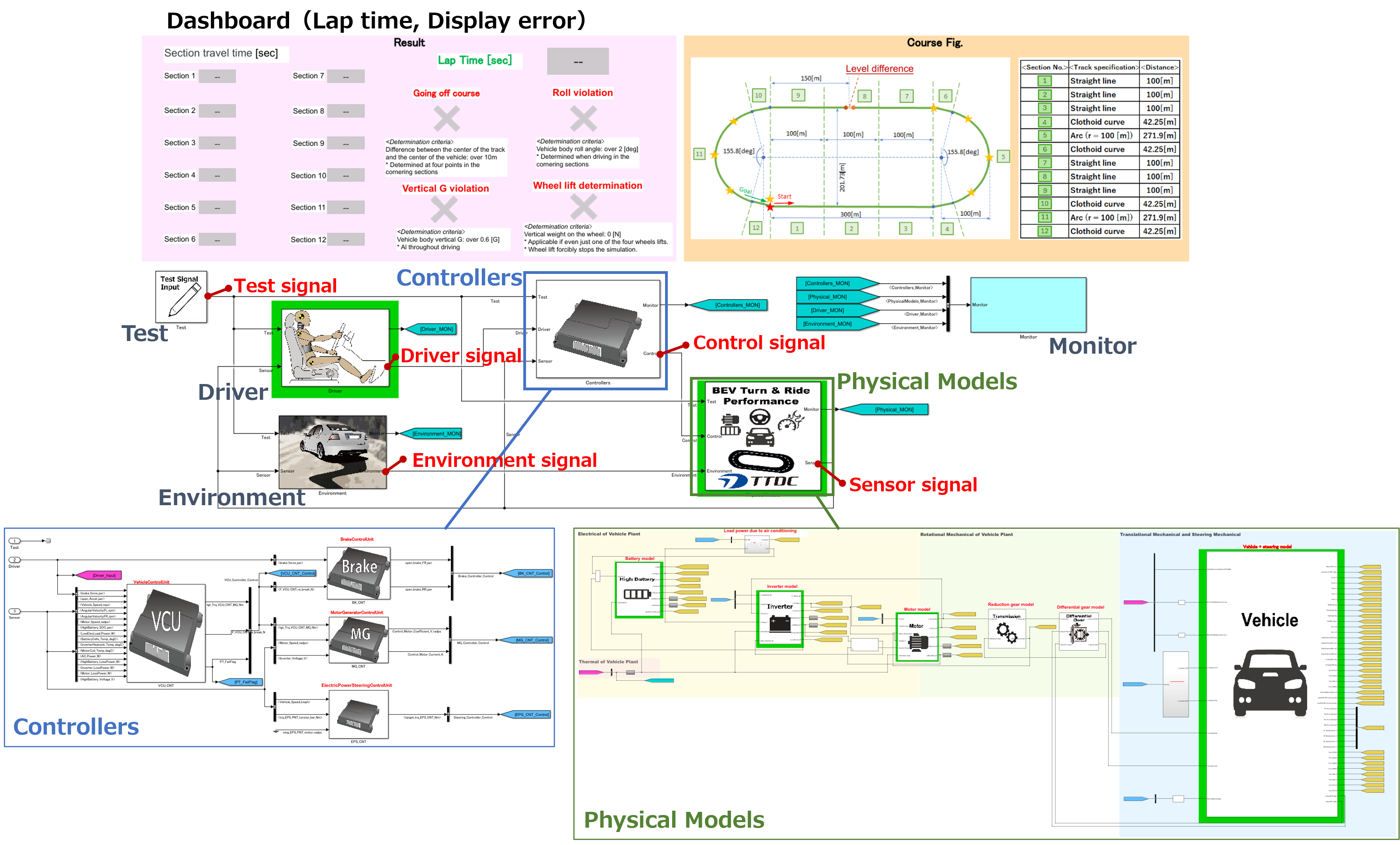オーバルコースに段差が用意されており、ロール角や上下加速度を計測して乗り心地評価することができる。車両の全体構成として、道路環境、ドライバー、制御、プラントモデルで構成されている。