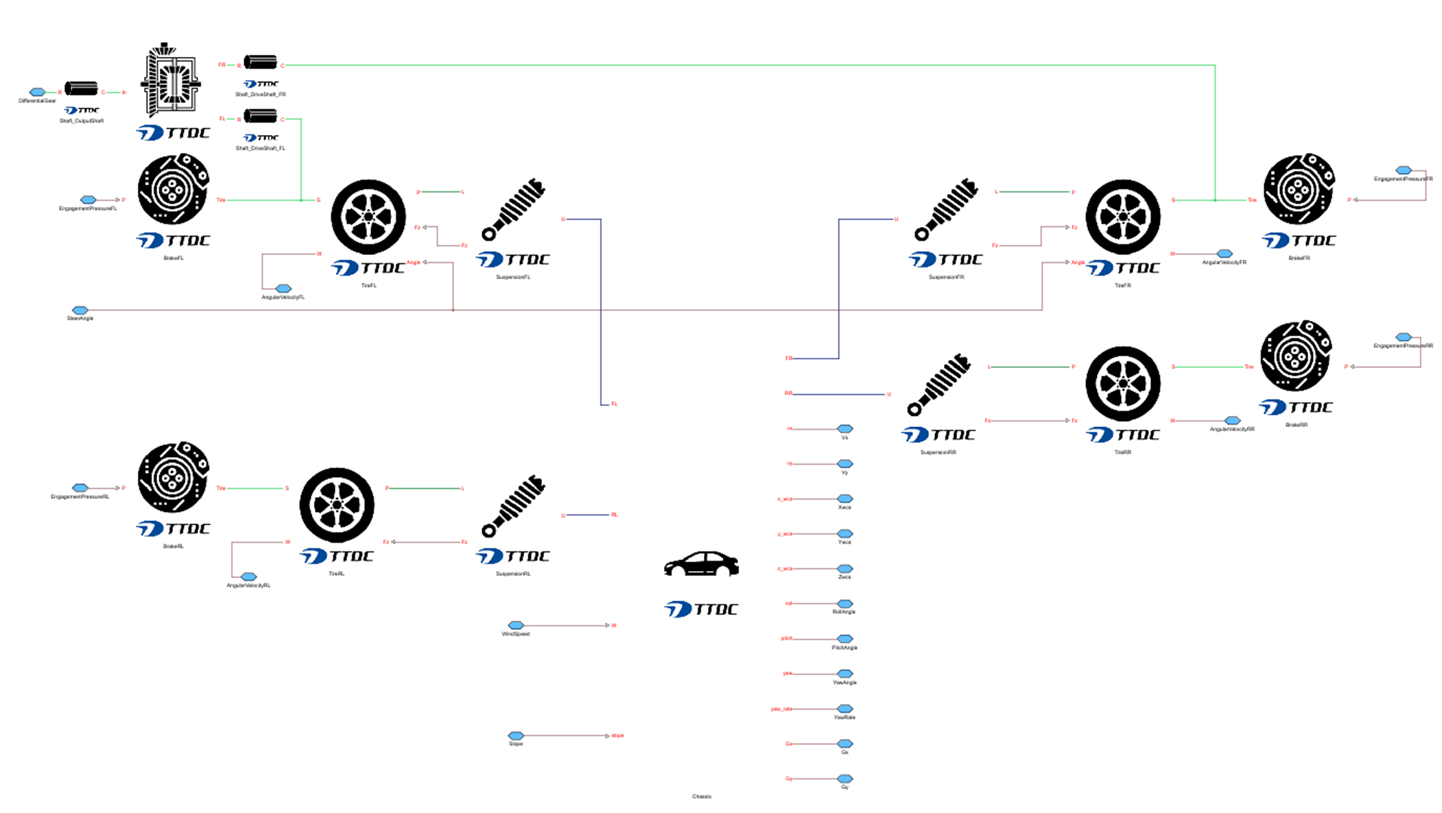 ディファレンシャルギア、シャシー、ブレーキ、タイヤ、サスペンションを組み合わせた3軸6自由度の車両モデル。