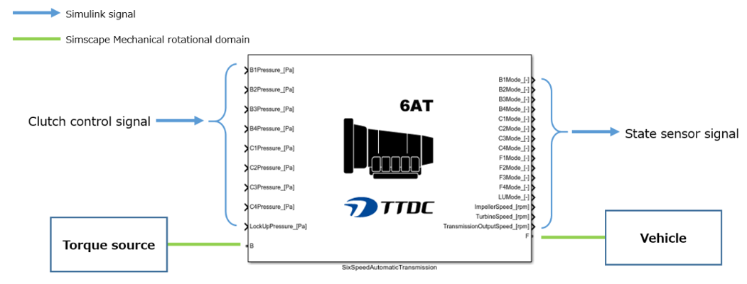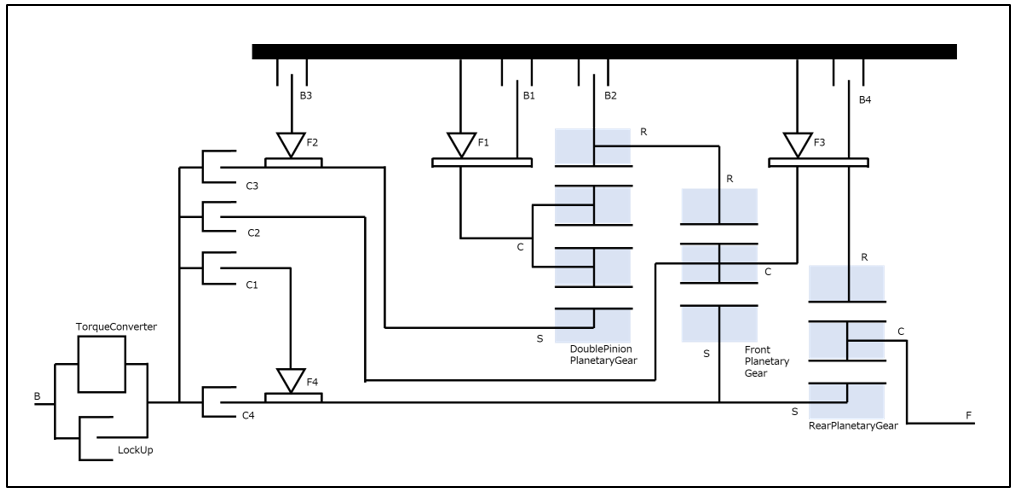 A six speed AT model that combines a torque converter, disc friction clutch, one-way clutch, double pinion planetary gear and single pinion planetary gear.